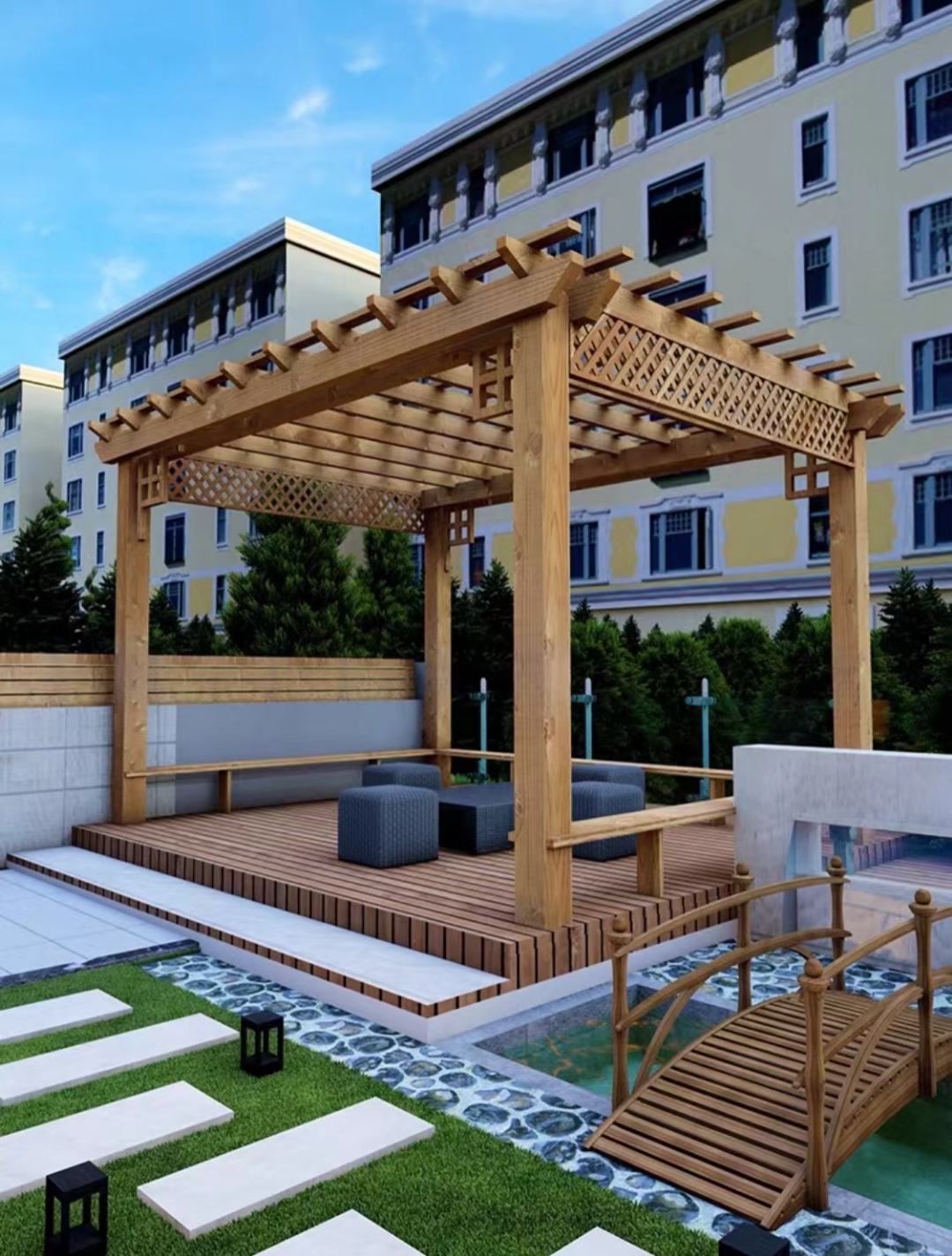 郑州众森防腐木厂主要承接轻、重型木屋、防腐木凉亭、防腐木花架、防腐木长廊、防腐木护栏、防腐木地板、防腐木栅栏、防腐木花池、防腐木秋千、防腐木垃圾桶、防腐木花园椅、健身器材等。